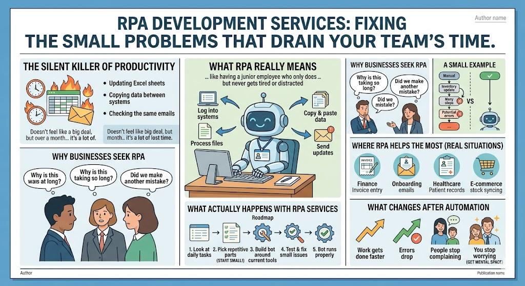 That is usually the point where people start looking into RPA development services not because they want fancy tech, but because they’re just tired of doing the same work every day.