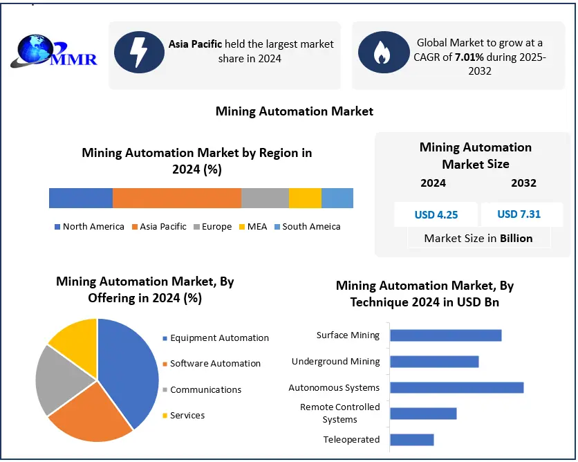 The Mining Automation Market was valued at USD 4.25 Bn in 2024, and total global Mining Automation Market revenue is expected to grow at a CAGR of 7.01% and reach nearly USD 7.31 Bn from 2025-2032, growth is driven by AI, IoT, and autonomous equipment.