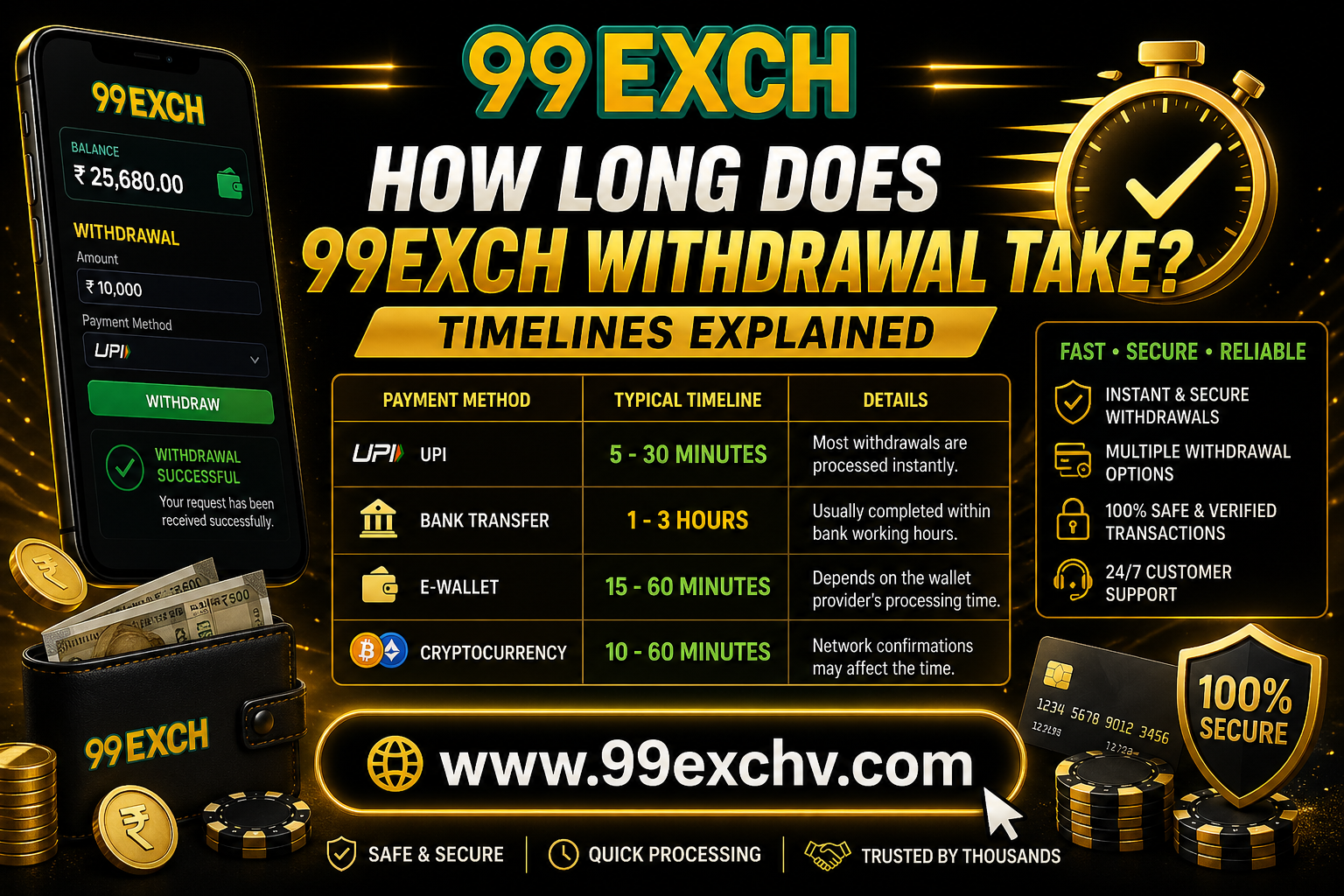 The withdrawal speed on 99exch depends on the method you choose. Based on platform insights: