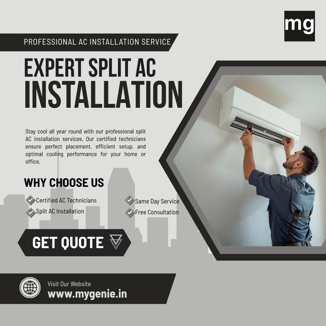 Get professional split AC installation with Mygenie for perfect setup and performance. Our experts ensure proper fitting, wiring, and testing for long-term reliability. Enjoy hassle-free installation at affordable prices.