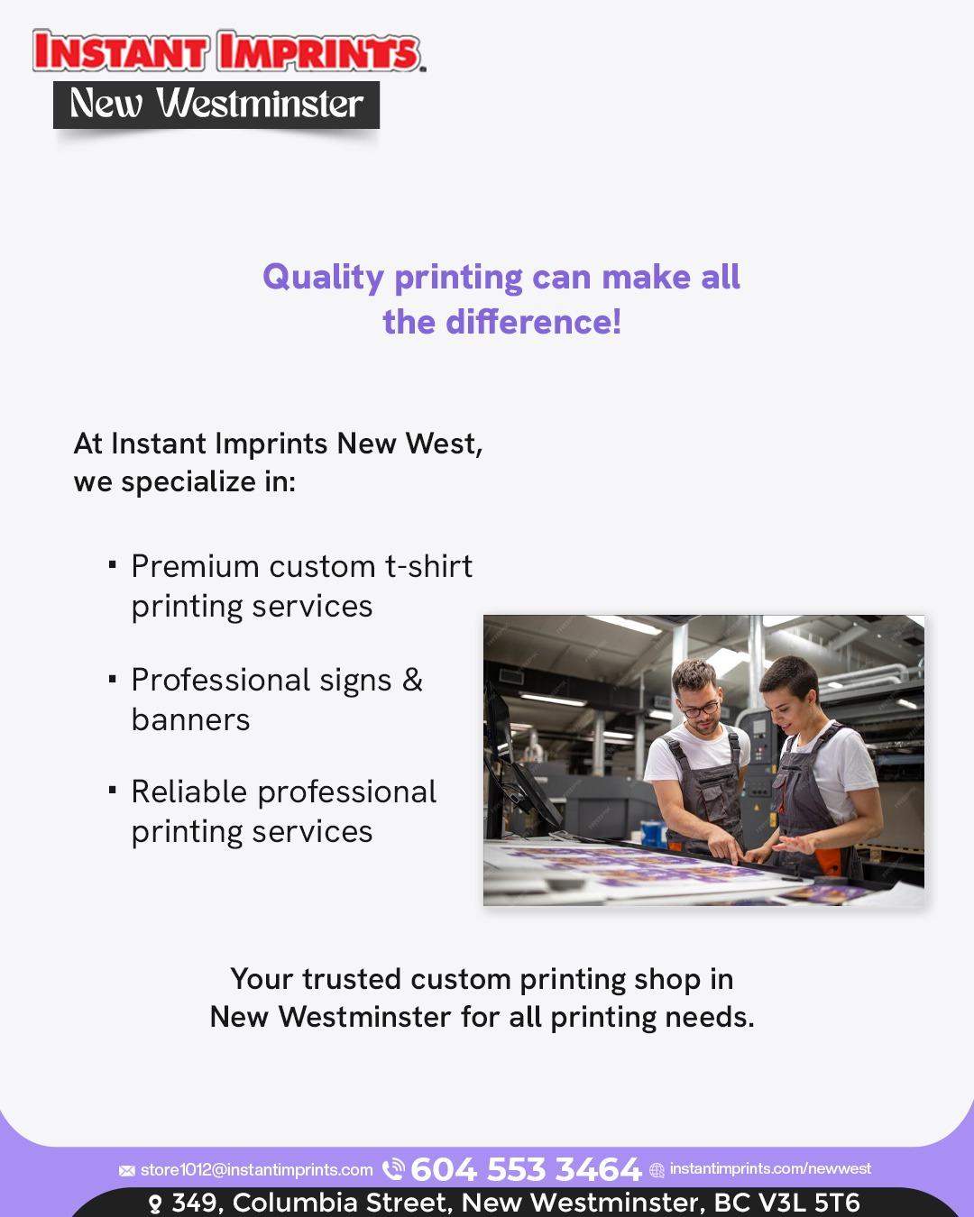 At Instant Imprints New West, we understand the power of great printing. Our Premium custom t-shirt printing services provide stylish, durable apparel that helps your brand shine. We also offer professional signs & banners and complete printing solutions designed to meet your goals. With attention to detail and a commitment to excellence, we deliver results you can trust.
